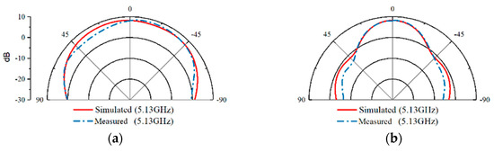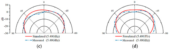 Then, the radiation pattern of the proposed MPA was measured by means of an anechoic chamber. Figure 15 shows the antenna’s simulated and measured radiation directions at 5.13 and 5.48 GHz, respectively. It can be seen that the measured results agree well with the simulation results, and the radiating sector beam is successfully realized at 5.13 GHz with a half-power beam width of about 141° in the E-plane and 32° in the H-plane, and a gain of about 8.2 dBi. The rectangular beam radiated at 5.48 GHz has an E-plane half-power beam width of about 100° and an H-plane half-power beam width of about 90°, with a gain of about 5.7 dBi. Small differences between simulation and measurement are due to manufacturing, installation and test errors. Finally, the performance comparison of the developed low-profile dual-band microstrip antenna prototype is shown in Table 2. The developed dual-frequency microstrip has its unique advantages, not only radiating a sector beam pattern at the first frequency point but also offering a unique rectangular beam pattern at the second frequency point and higher gain performance within a compact overall size limit.