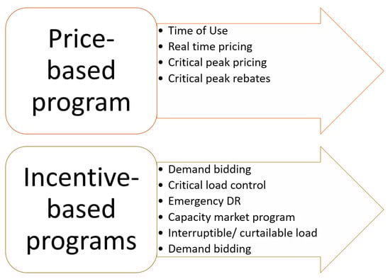 Demand-response programs are components of demand-side management programs incorporated into smart grids that encourage consumers to shift their energy consumption to off-peak hours in order to reduce peak demand [,]. When the electricity grid is stressed, the demand response (DR) is considered the most cost-effective and reliable technique to flatten the demand curve []. Demand-response programs reduce electricity costs for consumers, improve grid reliability and stability, reduce carbon emissions due to more efficient energy use, increase the use of renewable energy, and have the potential for new revenue streams for consumers through participation in demand-response programs. Figure 1 lists typical demand-response programs [].