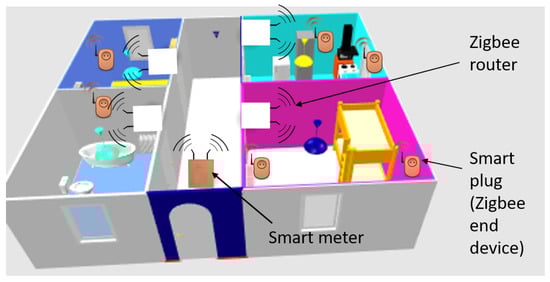 The proposed home-energy-management system (HEMS) is pictured in Figure 2. The smart plug scattered all over the residential areas scans, monitors, and controls home appliances. The measured electrical parameters are collected by smart plugs and transmitted through the Zigbee network, which consists of Zigbee coordinators and Zigbee routers. The smart plug acts as a Zigbee end node. The coordinator is used to connect the Zigbee routers. The latter is used to route data from the end node towards the smart meter. The measured electrical parameters are used by the smart meter to identify appliances by using the ML algorithm and to control the operation of the appliance based on the current electricity tariff. Below is a comprehensive description of the role of each device in the proposed HEMS.