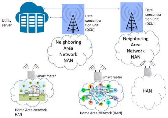The implementation of the demand-response program makes use of advanced metering infrastructure (AMI). AMI, which is shown in Figure 3, consists of smart plugs that are connected to a smart meter through a Home Area Network (HAN). Smart meters in a given geographic region are connected to utility servers by data concentrators by using a neighboring area network (NAN) []. The data concentrator is an embedded system that is composed of a power management unit, a communication unit, power line communication, and a control unit. Several communication technologies are available for the realization of the NAN. As pointed out in several studies, the following communication technologies support the data traffic and latency requirements of the AMI: fiber optic, broadband cellular communication (4G, 5G, and the future 6G) power line communication, radio frequency (RF) mesh network, and LoRa-IoT (Long-Range IoT) [,,,].