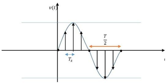 The algorithm works as follows: Given the analog signal , first, the signal is sampled with a sampling period (as depicted in Figure 7). The algorithm proceeds by computing the time when the voltage crosses the time axis. This condition is checked by using the sign of the product . Half of the period () is computed as the time difference between the instant of times when the voltage crosses the time axis (). To filter the noise, the minimum value is computed across all estimated .