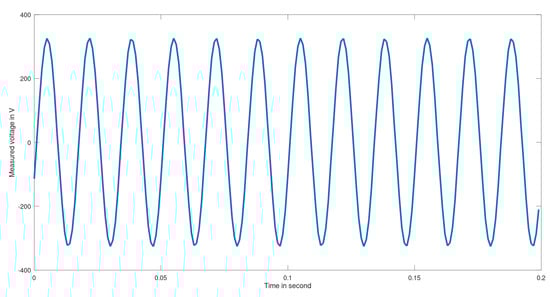 To validate the approach used to approximate the RMS value, we used an AC voltage . The RMS value of the voltage is V. Table 2 provides a summary of the comparison between the Trapezoidal technique and Equation (5). The table demonstrates that, for sampling frequencies higher than the Nyquist frequency, the Trapezoidal technique performs better than Equation (5).