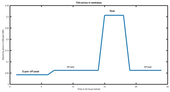 To quantify the importance of the devised approach for the realization of a demand response based on time-of-use (TOU) pricing, we consider the following scenario taken from the US market: The utility company, Peco, in the US offers consumers the option to enroll in the TOU program. The electricity is priced by time bands: the peak time is from 2 p.m. to 6 p.m. during weekdays; the off-peak time is from 6 a.m. to 2 p.m, from 6 p.m. to 12 a.m on weekdays, and from 6 a.m to 12 a.m. on weekends and holidays; and the super off-peak time is during the rest of the day. The prices are shown in Figure 11.