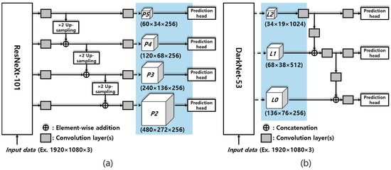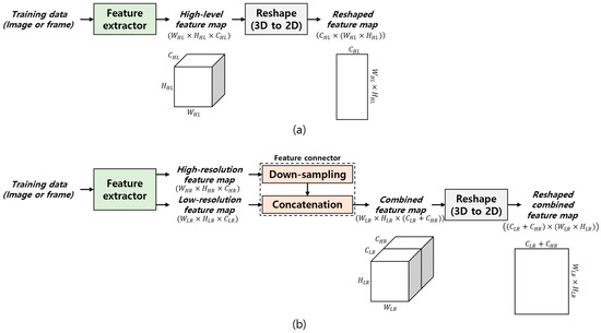 Block diagram of the process for generating reshaped feature map. (a) Reshaped feature map for each high-level feature map (P4, P5, and L2). (b) Reshaped combined feature map for low-level feature maps (P2 and P3, L0 and L1).