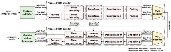 By predefining and using a generalized basis matrix and mean vector for each feature map based on the task, both on the encoder and decoder sides, there is no need for compression, thereby preventing compression degradation. As illustrated in Figure 2, the proposed encoder generates coefficients by centering using the TGM and TGCM and transforming using the TGB and TGCB for each feature map. To compress the coefficients with VVC, quantization and packing processes are performed. These are then encoded via VVC to generate a bitstream. On the receiving end, the proposed decoder performs unpacking and dequantization of the coefficients decoded with VVC. Following this, reconstruction of the multi-level feature maps is performed through mean compensation and inverse transform using the generalized basis matrix and mean vector. Finally, the reconstructed multi-level feature maps are fed into the machine vision inference network, as shown in Figure 2, to produce inference results for each task.