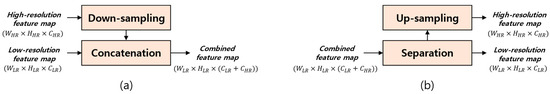 The deep-learning networks used for each machine vision task commonly employ an FPN structure that generates multi-level feature maps based on a top-down architecture as the backbone network [20]. There exists spatial redundancy between these feature maps. Therefore, to achieve effective compression, our method combines two low-level feature maps, P2 and P3, as well as L0 and L1, by leveraging the nearest-neighbor down-sampling used in the FPN structure and concatenating along the channel dimension. This process is represented in Figure 3a. Consequently, the feature map count is reduced by one, and the feature maps with the largest dimensions are eliminated. The decoded combined feature map is then reconstructed into each low-level feature map by performing an inverse process, as shown in Figure 3b. Consequently, one or two high-level feature maps, such as P4, P5, and L2, as well as the combined feature maps, are compressed. Furthermore, we use an independent set of TGB, TGM, TGCB, and TGCM for each feature map to be compressed, tailored to the specific machine vision task.
