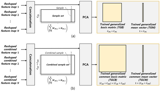 Block diagram of the process for obtaining generalized basis matrix and mean vector. (a) Generalized basis matrix and mean vector for each high-level feature map (P4, P5, and L2). (b) Generalized common basis matrix and mean vector for low-level feature maps (P2 and P3, L0 and L1).