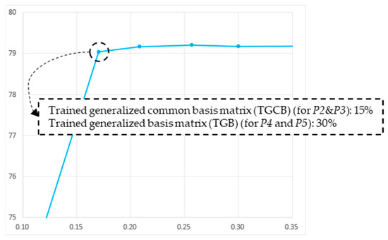 For evaluating the proposed method, three sets of generalized basis matrix and mean vector are required for object detection and instance segmentation, and two sets for object tracking. These were obtained through the GPCA process, as mentioned in Section 2.1. The dataset used in this strategy comprised 344 frames of TVD training videos selected by random sampling that for all tasks were not duplicates of the test data. Furthermore, the quantities of TGB and TGCB were determined at a saturation point for each machine vision task by comparing the amount of data to be compressed and the corresponding performance (mAP and MOTA) according to the TGB ratio. As illustrated in Figure 8, the quantity of TGCB for P2 and P3 was set at 15%, and the quantity of TGB for P4 and P5 was set at 30%. At this point, mAP reached saturation in object detection. The TGB ratio reached saturation in instance segmentation at the same point as in object detection. Additionally, MOTA reached saturation in object tracking when the quantity of TGCB for L0 and L1 was set at 30%, and the quantity of TGB for L2 was set at 20%.