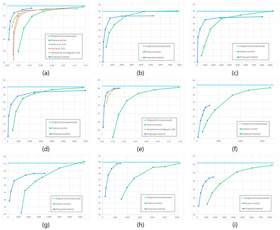 RP curves for each machine vision task (x axis: bpp or bitrate, y axis: mAP or MOTA). (a–d) Object detection; (e) instance segmentation; (f–i) object tracking. (a) OpenImage V6 dataset (b) Class AB of SFU-HW-Objects-v1 dataset; (c) Class C of SFU-HW-Objects-v1 dataset; (d) Class D of SFU-HW-Objects-v1 dataset; (e) OpenImage V6 dataset; (f) TVD-01 of the TVD dataset; (g) TVD-02 of the TVD dataset; (h) TVD-03 of the TVD dataset; and (i) overall for the TVD dataset [12,13,14].