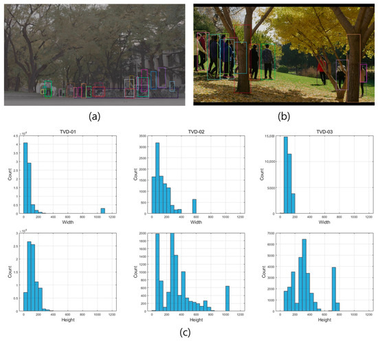 Ground truth of the TVD dataset (a) Example of TVD-01. (b) Example of TVD-03. (c) Histogram of bounding box size (width, height) of all ground truth for the TVD dataset.