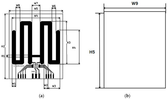 Under the above conditions, the radiation pattern of the RFID antenna is the direction of the bidirectional path (backfire and endfire radiation). In the context of bidirectional radiation, it is essential to note that the direction of maximum gain is perpendicular to the broadside radiation, known as endfire radiation. This means that the primary radiation direction aligns with the maximum radiation direction of the RFID antenna. Additionally, it is essential to ensure that the antenna possesses both high gain and wide bandwidth to meet the requirements. Based on the description provided, approximately 70 antenna simulations were conducted to evaluate the antenna’s performance. These simulations confirmed that the antenna meets the required specifications. As a result, the optimized results were used to manufacture the tree-shaped antenna. The specific configuration and dimensions of the proposed antenna can be seen in Figure 2a for the front dimensions, Figure 2b for the back dimensions and Table 1, respectively.