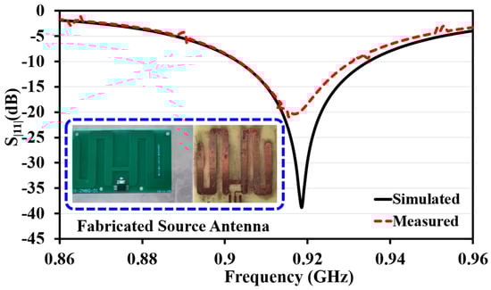 The comparison between the simulated and measured results for the antenna can be observed in Figure 4. The simulated value is observed to be −38.8 dBm, while the measured value is at −19.32 dBm. The source antenna achieved a simulated and measured BW and fractional percentage bandwidth (FBW) of 0.9024 to 0.9354 MHz and 0.9034 to 0.9310 MHz, respectively. Compared to the simulated results, the observed differences in the attenuation of both the antenna and rectifier measurement results can be attributed to various factors. These factors include the manual fabrication of the components, the losses, heat dissipation occurring in the conductor and substrate layers, and the tolerances present in the fabrication process.