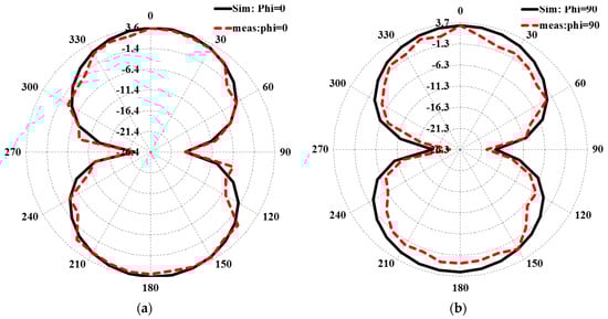 The peak gain of 3.54 dB is realized through measurement, and the measured and simulated radiation patterns are shown in Figure 4a,b. The antenna excitation is positioned on the E-plane at Phi = 0 and H-plane at phi = 90. It is observed that the beams are of a cross-polarization nature, whereby the antenna forms a plus (+) sign or a cross (×) shape. For example, they are oriented at right angles (90°) to each other, and the measured results reasonably agree with the simulated results.
