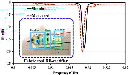 Figure 6 illustrates the corresponding results for the measured and simulated rectifier under an input power of −20 dBm. The simulated value is observed to be −18.62 dBm, while the measured value is at −20.21 dBm. The observed differences in the attenuation of both the antenna and rectifier measurement results, compared to the simulated results, can be attributed to many factors; in this case, we see that the measured results fare higher than the simulated. Variations in dimensions, alignment, and soldering can lead to variations in antenna performance among different fabricated units. The presence of variable capacitors helps increase rectifier return loss by allowing for the fine-tuning of the impedance matching between the rectifier circuit and the load. Variable capacitors can compensate for component variations and tolerances in the rectifier circuit. These variations can impact impedance matching and lead to suboptimal return loss. By adjusting the capacitance, the variable capacitors can help mitigate the effects of component variations and improve overall performance.