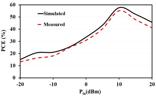 Based on Figure 8, it is clear that the RF energy harvesting circuit attains a peak PCE of 55.14% at the operating frequency of 919 MHz when the input power is at 12 dBm. It is calculated with the aid of Equations (1) and (2).