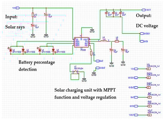 Figure 10 illustrates the solar energy harvesting circuit developed for this work. The circuit serves as a module dedicated to harvesting solar energy. Notably, the circuit incorporates an IP5305 IC which consists of an inbuilt FOV MPPT algorithm, facilitating MPPT and offering features like self-discharge and round-trip efficiency. To ensure stable operation, capacitors have been included in the circuit to mitigate ripple voltage. Additionally, the presence of LEDs indicates the solar panel’s battery percentage, with distinct levels represented at 25%, 50%, 75%, and 100%.