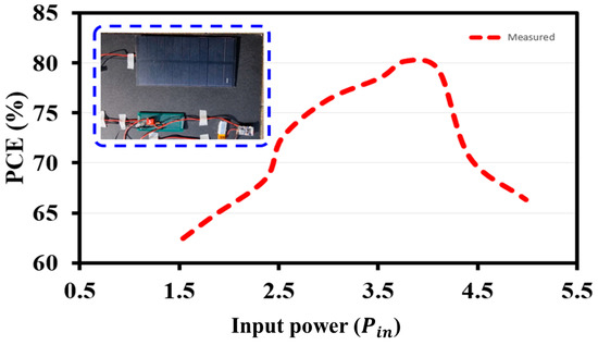Figure 15 illustrates that the hybrid energy harvester’s peak PCE reaches 86.49%. This optimal efficiency is attained when the input power is 3.92 W, resulting in an output voltage of 5.35 V and an output current of 0.634 A. These findings demonstrate the hybrid harvester’s effective conversion of received DC power. The system incorporates a rechargeable battery, crucial in supplying power as it can be recharged and replenished. Notably, the hybrid harvester exhibits a higher output power of 3.39 W, compared to standalone harvesters, indicating improved performance and enhanced power delivery capabilities to the load, such as the LiPo battery. This voltage increase confirms the RF harvester’s significant contribution to the hybrid system’s power generation. It is worth mentioning that any losses experienced in the system can be attributed to factors such as fabrication tolerance, parasitic losses, or faulty components. Furthermore, it should be noted that using a breadboard and jumper wire connections introduces resistance, which leads to converting electrical energy into heat energy. This dissipation of heat occurs in the surrounding area. Additionally, the efficiency of the hybrid harvester system is considerably higher compared to a standalone solar energy harvester.