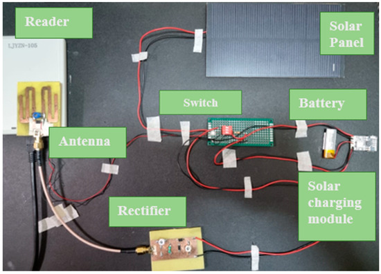 The standalone systems are integrated and subjected to an efficiency experiment to evaluate the overall performance and peak efficiency of the harvesting unit. This experiment aims to assess the collective effectiveness of the system and measure the highest efficiency achieved by the harvesting unit. The DC combining circuit is connected in series and attached to a switching mechanism to turn battery-assisted passive (BAP) and active modes on and off for the RFID antenna and to charge the solar panel.
