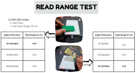 With regard to the fabricated tag, it is noticed that the 45° elevation provided the greatest read range among the three elevation angles at an input power of 15 dBm. The angle of elevation is chosen as the reference antenna (which the fabricated antenna design is based on) used was tested for an input power of 10 dBm at different angle of elevations. This angle that provided the highest read range was selected and tested with different input powers for the fabricated tag. Therefore, the antenna which is designed is designed in such a way that it has to surpass the current reference antenna’s read range. The read range of a near field tag reader, also known as an UHF (Ultra-High Frequency) Near Field RFID (Radio Frequency Identification) reader, in this case, a LJYZN-105 reader, is used due to the budget limit for the project. It runs at the UHF frequency range of 902 MHz to 928 MHz, and its read range is normally restricted to a maximum of 18 cm. Figure 14 shows the reader observation during testing phase and HEH measurement setup.