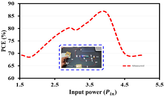 Based on Figure 8, it is clear that the RF energy harvesting circuit attains a peak PCE of 55.14% at the operating frequency of 919 MHz when the input power is at 12 dBm and an output power () of 2.04 W and output voltage of 3.24 V. It is calculated with the aid of Equations (1) and (2).