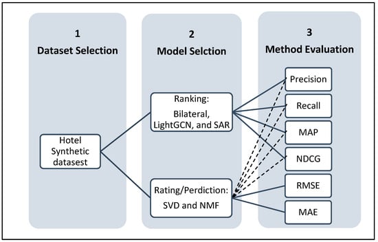For our experiment, we evaluated the effectiveness of different CF techniques in predicting ratings and recommending the top 10 relevant tourist attractions to the user. Figure 1 illustrates the procedures applied in our work. First, we chose the tourism dataset. Next, we applied four CF algorithms designed to rank and predict hotel ratings. For ranking, we used the bilateral, LightGCN, and SAR models. For rating prediction, we employed two matrix factorization techniques, namely, SVD and NMF.