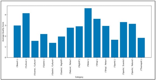 The dataset contains 345,000 ratings provided by 100,000 users who rated 23 items. This dataset can be used by researchers to develop and evaluate RSs in the tourism domain. Figure 2 presents the quality score for each category in the dataset.