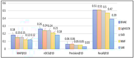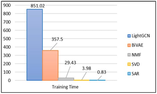 Additionally, the training time durations of the models were examined, as illustrated in Figure 5. The LightGCN model exhibited the longest training time, requiring 851.02 s, while the SAR model demonstrated exceptional efficiency with a training duration of only 0.83 s. The BiVAE model, with a training time of 357.50 s, outperformed the LightGCN model in all evaluated metrics. Notably, the BiVAE model consistently demonstrated superior performance across all metrics, showcasing its efficacy within the context of our study. Conversely, the SAR model exhibited comparatively weaker performance when compared to the other models. These findings highlight the superior performance of the BiVAE model and emphasize the potential limitations of the SAR model in our specific investigation. As part of our future work, we aim to incorporate alternative models and further refine our proposed model to enhance its overall performance in the recommendation process.