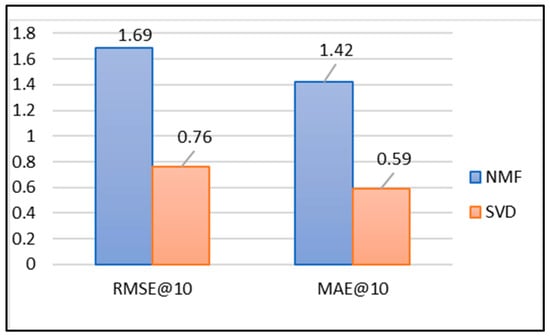 Figure 4 shows that SVD achieves a lower error rate with an RMSE and MAE of 0.76 and 0.59, respectively, which indicates a good result. This suggests that on average, the error in predicted ratings is less than one. Furthermore, the RMSE of both models is slightly higher than the MAE: SVD achieved an RMSE and MAE of 0.76 and 0.59, and NMF achieved an RMSE and MAE of 1.69 and 1.42, respectively. This is expected since higher errors are penalized more.