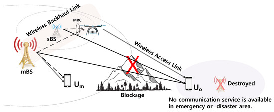 In the URNs, the SINR enhancement of a wireless backhaul link is the key to guaranteeing a reliable relay link to isolated user equipment without throughput degradation of another UE in the URN. Several studies have focused on achieving a stronger backhaul link in the URN by focusing on optimal UAV placement and resource allocation [25,26,27,28,29,30,31]. In [25], the resource allocation of the transmission power, bandwidth and transmission rate, and the position of the UAV relay node are jointly investigated to maximize the system throughput. The formulated problem is transferred to a monotonic optimization problem to achieve the optimal global solution. Ref. [26] considered a cellular-to-UAV and an air-to-ground path loss model for the wireless backhaul link and downlink scenario, respectively, to solve the problem of the efficient placement of an aerial relay node for the overall throughput maximization. Ref. [27] cooperatively optimized the UAV trajectory and relay power allocation to maximize the minimum achievable information rate for the communication link between two ground users. Ref. [28] utilized multiple UAVs and proposed a UAV deployment algorithm to provide seamless relay connectivity to a remote user and maximize the average data rate of the user in the URN. In [29], an orthogonal transmission at the BS with a decode and forward (DF) relay scheme was considered to optimize the throughput of , but without considering that of other UE. Ref. [29] introduced non-orthogonal transmission at the BS in the URN, which could effectively extend the service range of the BS, and increase the throughput capacity compared to the orthogonal transmission. Ref. [30] applied non-orthogonal transmission to URN and proposed optimal resource management of transmit power and time at BS and UAV to maximize the throughput of the UE within a BS service range and simultaneously guarantee seamless relay transmission to . Ref. [31] proposed UAV deployment and the time allocation algorithm for fast and optimal UAV deployment. It first determines the minimum required transmission time slots between ground BS and UAV and between UAV and a remote user to ensure a robust wireless backhaul and access link.