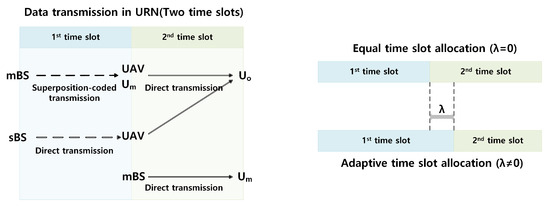 We consider two-hop downlink relay networks, where an cannot have a direct transmission link from the nearby mBS and sBS due to severe blockages or under an emergency state, as shown in Figure 1. A relay transmission in the URN consists of two time slots, as shown in Figure 2. In the first time slot, the transmission from mBS or sBS is considered, where mBS uses a non-orthogonal transmission to transmit a superposition-coded signal to the UE in the macrocell () and UAV simultaneously, or sBS utilizes orthogonal transmission to transmit the data to UAV, respectively. It is well known that a non-orthogonal transmission at mBS in the URN achieves superior performance in terms of the overall throughput of the UE in the macrocell over an orthogonal transmission [30]. sBS supports mBS when the wireless backhaul link cannot provide a reliable relay link to and sBS has extra time resources. Therefore, we assume that sBS utilizes orthogonal transmission to maximize the throughput enhancement. In the second time slot, UAV forwards the received data in the first time slot to . It is assumed that the channel condition between mBS and is better than that between mBS and UAV in general, because UAV remains closer to to set a strong LOS air-to-ground link.