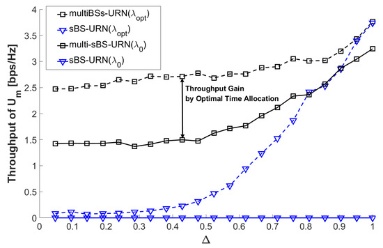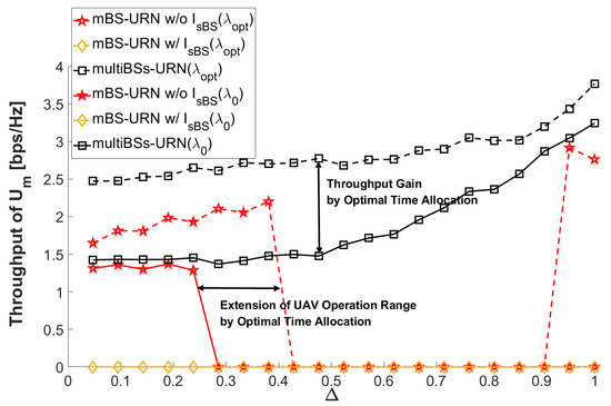 In this section, we present the simulation results to demonstrate that multi-BSs-URN achieves a higher throughput of without an outage of over mBS-URN or sBS-URN. In addition, it is demonstrated that an optimal time allocation extends the operation range of UAV compared to an equal time allocation (i.e., , denoted as in Figure 3 and Figure 4) and achieves a larger throughput gain.