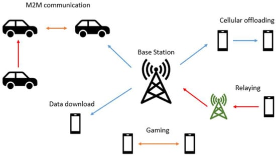 D2D is regarded as a novel communication technology. During the process of D2D communication, users usually have at least two adjacent terminal devices and begin with the same application services, such as social interactions, cooperative games, multi-screen control, Push-to-Talk, etc. A connection needs to be established through procedures such as device searching and pairing. In summary, D2D communication technology refers to direct communication between two peer-to-peer communication nodes. In a distributed network that consists of D2D users, each user node can not only receive and send signals, but also have the function of automatic forwarding. D2D communication technology has different applications in different networks, for example, peer-to-peer in ad hoc networks and machine-to-machine in IoT. A schematic diagram of some D2D application scenarios is shown in Figure 1.