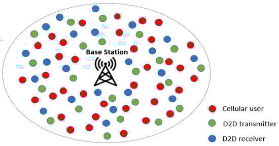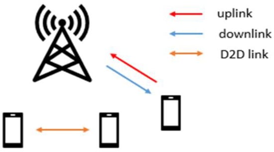 With the rapid development of the fifth-generation (5G) communication network and the Internet of Things (IoT), 5.3 billion Internet users will have access to the Internet of Things by 2023 [], resulting in wireless spectrum resources gradually becoming insufficient for use. Recently, device-to-device (D2D) communication has gained a lot of attention because it allows messages to be transmitted directly between devices without going through access points or base stations (BSs). The D2D communication technology can not only improve the spectrum efficiency and energy efficiency, but also offloads the traffic of the cellular BS and reduces end-to-end delay [,]. Although the coexisting network environment of traditional network and D2D communication has such distinct advantages, some potential issues still need to be addressed, such as synchronization between devices and interference. Without proper management, these issues may damage the service quality of the existing cellular network system.