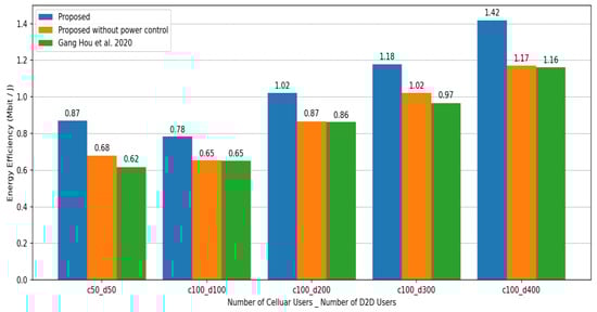 Lastly, we performed a comparison of three approaches in terms of energy efficiency, as shown in Figure 15. From the figure, we can see that the energy efficiency of our approach increased as the number of D2D users increased. With power control, the energy efficiency could be enhanced by 20%. Although the system throughput of our approach with power control was less than the system throughput without power control, there was a big gap in energy efficiency between the two methods. This demonstrates that our scheme with power control is effective and feasible.