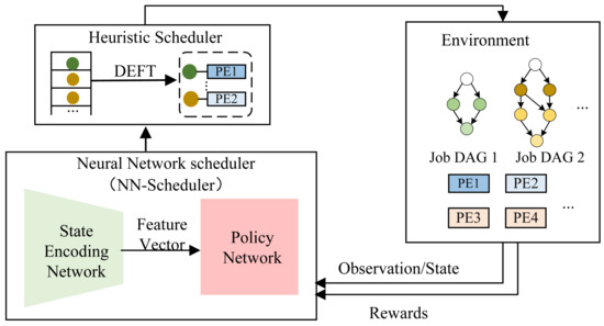 NN-Scheduler solves the multitask prioritization problem, which contains state encoding network and policy network. As shown in Figure 3, the state encoding network is used to encode the job DAG into feature vectors, and the policy network is used to prioritize the tasks.