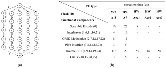 Figure 5. (a) WIFI-Tx’ DAG; (b) WIFI-Tx task execution time on different PEs profiles.