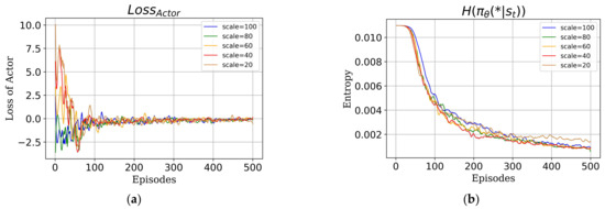 Figure 9a illustrates the convergence process of actor network during training. It can be observed that the actor–critic strategy results in convergence around 100 episodes. The fast convergence of LOSS Actor in MASA proves its stronger learning ability in dynamic environments.