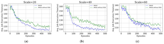 Figure 9b presents the change of entropy H π θ · | s t in Equation (18), describing the task environment faced by the scheduler. As training progresses, the MASA network effectively resolves the job DAGs, leading to a gradual reduction of uncertainty in the environment. Lower values of H π θ · | s t are indicative of the fact that MASA effectively encodes the complex environment so that its complex state space can be mapped into a relatively stable encoded vector space.