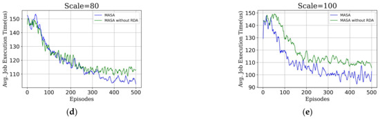 In Figure 10, we plot the convergence of the training results of the MASA algorithm with and without the RDA optimization method during training at different application arrival rates. The introduction of the RDA method makes it clear that the network converges to a stable state earlier and the final training results in better performance. The RDA optimization method maintains the average application execution time in a more stable state, even with changes in the arrival rate of applications. RDA solves the reward inaccuracy problem by buffering the rewards under clock signals, thus improving the performance of network training. RDA is a lightweight optimization method that can be directly applied to similar application scenarios, as it only memorizes the decision start and end times of the task in comparison to the traditional RL method.