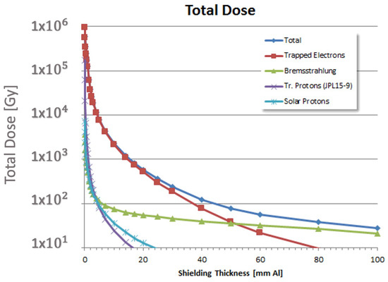 Regarding the TID analysis, the general model used for ionizing dose is SHIELDOSE-2 RD, and an updated version called SHIELDOSE-2Q RD is used for the Juice mission due to its capability to treat higher-energy electrons. The method uses a precomputed dataset of doses from electrons, electron-induced Bremsstrahlung, and protons derived from Monte Carlo analysis. The dose is provided as a function of material shielding thickness. In Figure 1, the dose–depth curve is represented as a function of spherical aluminum shielding thickness, and it shows that the dose is dominated by trapped electrons, as well as that the contribution of trapped protons is insignificant compared to that of solar protons. The accumulated dose of solar energetic protons is shown in the figures with a 90% confidence level that higher doses will not be observed.