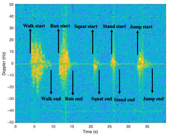 The CW radar is the simplest and most efficient solution in cases where the detection of the moving object is the only, and outstanding, task [18,27]. Figure 2 shows the Doppler signature, capturing 40 s during which an individual cycles through five activities: walking, running, squatting, standing, and jumping. The y-axis in the figure denotes the Doppler dimension, while the x-axis highlights the time progression. Figure 2 distinctly showcases the varied Doppler signatures associated with different activities. For example, a negative frequency shift is observed when the participant squats, indicating movement away from the radar. Conversely, a positive frequency shift arises when the participant stands, symbolizing movement toward the radar.