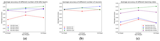 The average accuracy of using two targets’ data to train and using the remaining one target’s data to test with different model parameters: (a) various Bi-GRU layers, (b) various neurons, (c) various learning rates.