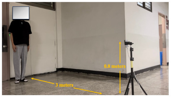 Data were collected from three participants, aged between 23 and 31, on the sixth floor of the Hwado Office Building at Kwangwoon University. Table 2 provides the primary physical attributes of these participants. The radar was positioned at a height of 0.8 m, with a distance of 3 m from the participant. Figure 7 depicts the layout of the environment and radar setup.
