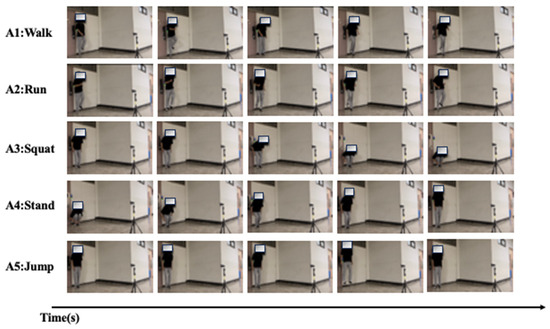Based on the purpose of detecting human activities in disasters, we designed several activities commonly used in disasters. The data include five human activities as shown in Figure 8: walk (A1), run (A2), squat (A3), stand (A4), and jump (A5). While each activity is presented as a distinct action, they were executed in a continuous sequence. Most research collects discrete activity. For example, the participant performs a single activity during one collection. However, we collected continuous activity. The participant performs five different activities continuously during one collection because activities in real-life scenarios tend to be continuous. Upon activating the radar, participants carried out all five activities in random order without constraints. Each data collection session lasted 40 s, during which participants completed all five activities. People can perform the five activities in a random order and the speed of the activity also depends on the participant. One important point is that the participant must perform all five activities in the 40s collection time, and each activity can only be performed one time. Such a session is termed a “group”, and every participant undertakes 20 groups. With three participants, this totaled 60 groups within a singular experimental setup. Each group was segmented into 200 bins, each lasting 0.2 s. Each bin was labeled according to the activity conducted during that time. Subsequently, these bins were inputted into the model group by group.