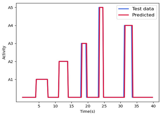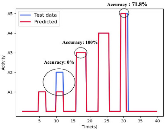Figure 9 shows an example result of a group; the blue line is the actual activity of the participant, and the red line is the participant’s activity that the model predicts. The accuracy of the group is determined by comparing the blue line and the orange line. The accuracy of each activity is determined by comparing the blue line and orange line in each activity in the group. Many papers use the data of the same target to train and test. However, when they use the same target’s data to train and test, this means that the model already learns the feature of the test target. Therefore, it cannot show that the model has a good generalization ability. In our experiment, we use different targets to train and test to let the results be more persuasive.