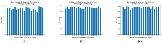 The accuracy of each group when we use two targets’ data to train and use the remaining one target’s data to test: (a) use the data of 2nd target and 3rd target to train, and use the data of 1st target to test; (b) use the data of 1st target and 3rd target to train, and use the data of 2nd target to test; (c) use the data of 1st target and 2nd target to train, and use the data of 3rd target to test.