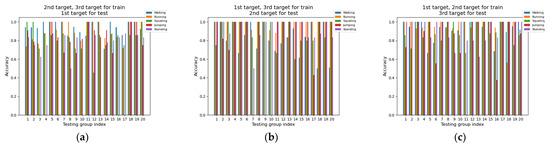 Figure 12 presents the accuracy of individual activities across groups, using two targets’ data for training and the remaining one target’s data for testing. From Figure 12, we can see that the best result is Figure 12c, followed by Figure 12b, and most of the accuracies in both are over 90%. Then, there is Figure 12a, in which most of the accuracies are over 80%. From Figure 10 and Figure 12, we can see that the model behaves well when using the data of the second target and third target to test, and the model behaves less well when the data of the first were used for testing.