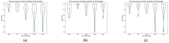 Figure 13 illustrates a violin plot of the accuracy for five distinct activities across different targets. The mean accuracies for the activities walk and run consistently surpass 95%, except for the walk activity in Figure 13b. This high accuracy can be attributed to the extended duration of walking and running relative to other activities, allowing the model to glean more characteristic features from these two activities. In contrast, the average accuracies for the squat activity are approximately 90% in Figure 13b,c but drop to approximately 80% in Figure 13a. The jump and stand activities yield mean accuracies of approximately 85% in Figure 13b,c. However, these values significantly dip to approximately 65% in Figure 13a. One potential explanation is the inherent variability in the way different targets perform the same activity, leading to inconsistent accuracy when different targets’ data are used for training and testing, as observed in the jump and stand activities within Figure 13a.