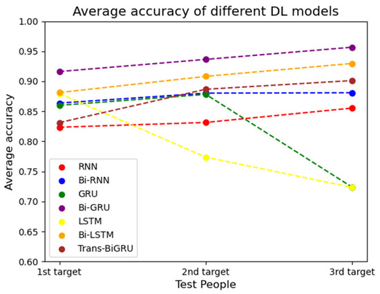 To evaluate the performance of the proposed scheme, we compared the average accuracy of the group for the three participants with different deep learning models, as shown in Figure 14. As the figure indicates, the Bi-GRU approach consistently achieves average accuracies exceeding 0.9 for all participants, succeeded by the Bi-LSTM model, which yields average accuracies over 0.9 for the second and third targets. The worst is the LSTM scheme, in which the average accuracy for first target is approximately 0.88, the accuracy for the second target is approximately 0.77, and the accuracy for the third target is only approximately 0.72. Conversely, the Bi-GRU scheme achieves the best performance.
