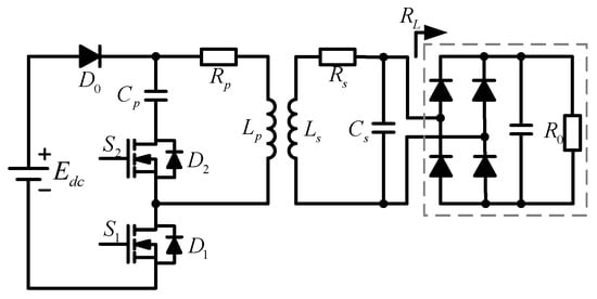 The main circuit diagram of the IPIFR-WPT system is shown in Figure 1. The diode D0 is used to prevent current backflow. The switch S1 is used to connect the dc voltage source Edc to the circuit of the primary side. Besides, there is a switch S2 control to access the resonant capacitor Cp on the primary side. The primary self-inductance Lp with internal resistance Rp and the secondary self-inductance Ls with internal resistance Rs constitute the mutual inductance coil, the main power transfer element. Additionally, between the primary coil and the secondary coil, M is the mutual inductance and k is the coupling coefficient. Cs is the filter capacitor on the secondary side. In addition, a rectifier bridge in parallel with a relatively large capacitor C0 in the secondary side to filter a dc output, and the real load R and the equivalent load RL have the following relationship [21]: